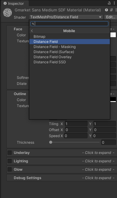 SDF를 만든 후 SDF 재질을 클릭하여 해당 설정을 엽니다. 기본적으로 PC에 이상적인 'TextMeshPro/DistanceField'를 사용합니다. 모바일용으로 개발 중이라면 TextMeshPro/Mobile/DistanceField로 전환하세요.