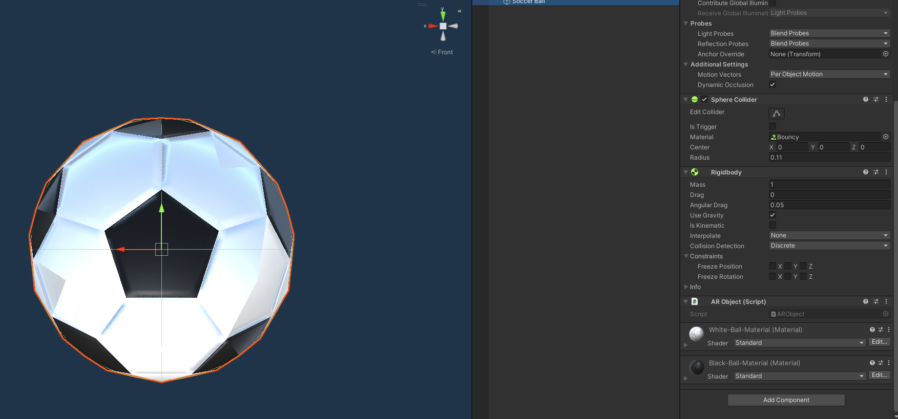 물리학 법칙을 적용하기 위해 통통 튀는 효과를 줄 오브젝트에 리지드바디 컴포넌트를 부착해야합니다. Use Gravity가 선택되어 있는지 확인합니다.