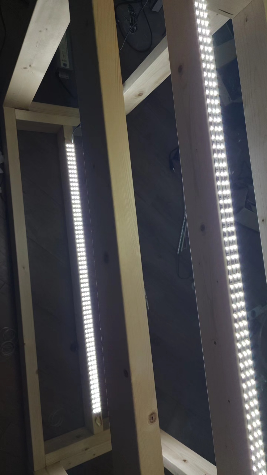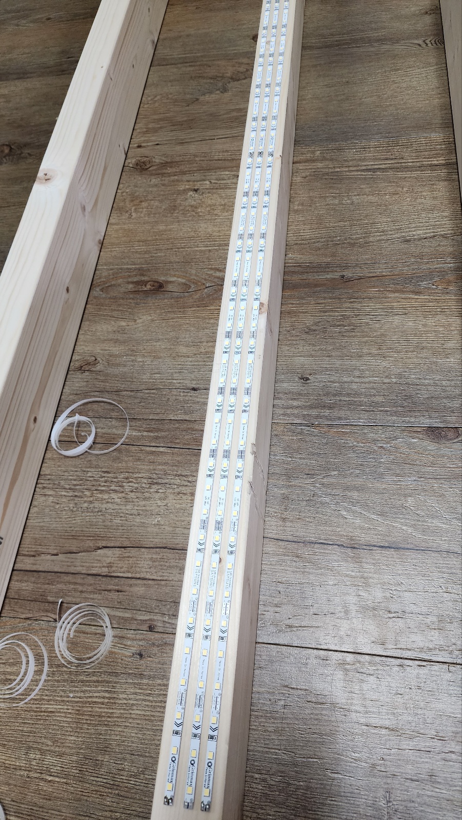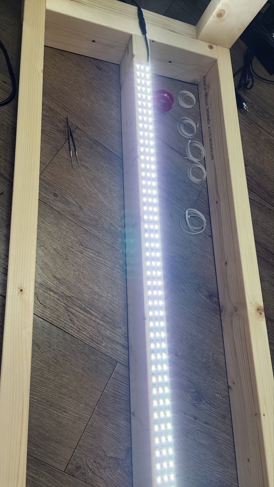 LED의 뒷면을 뜯어 축양장에 이쁘게 붙여주고 50cm LED를 두개 이어붙여 한줄로 만들었다