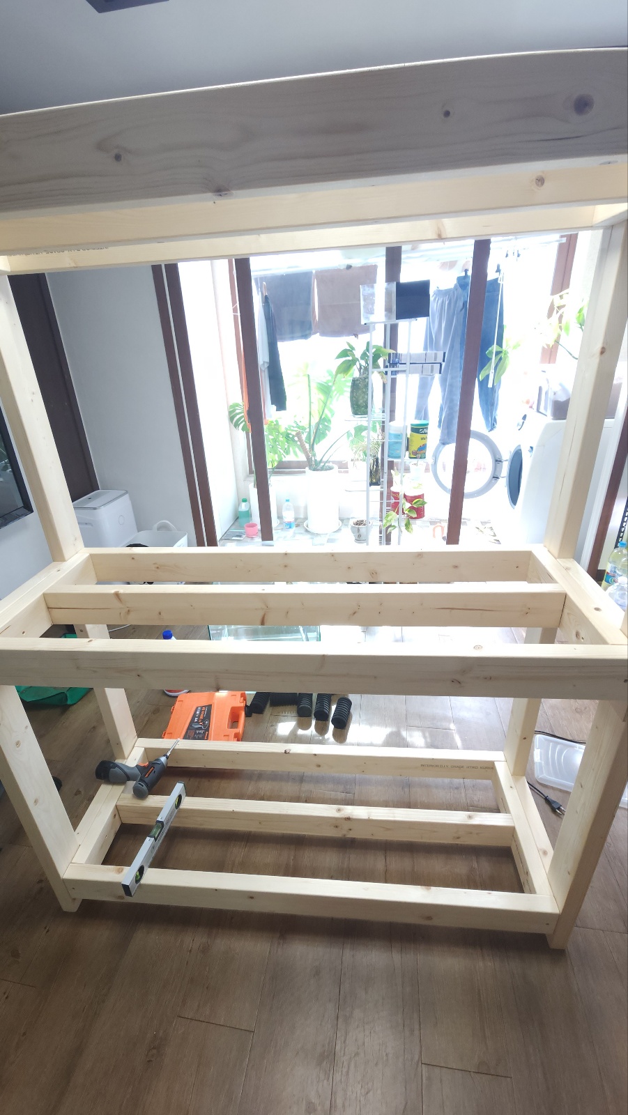 맨 아랫부분은 바닥에서 5cm정도 띄워서 결합하는데 이 부분이 수평 맞추기가 많이 힘들었다