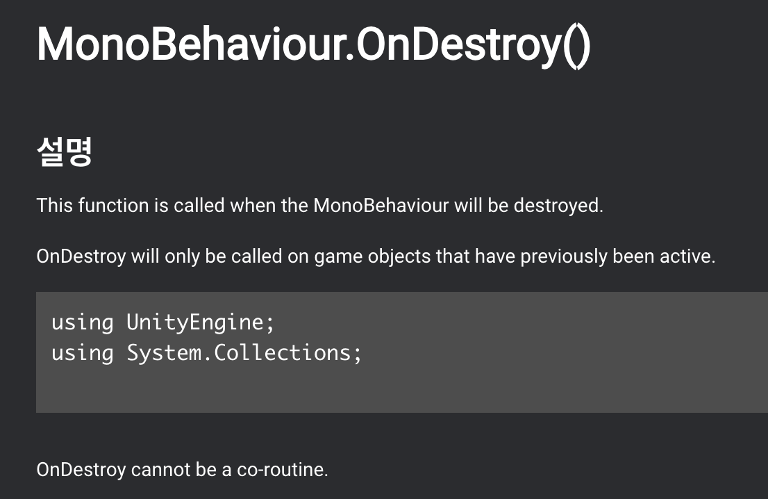 공식문서의 설명을 보면 MonoBehaviour를 상속 받는 객체가 파괴 될 때 호출된다고 적혀 있습니다. 이 글을 보시는 분들은 다들 이 부분은 알고 계실것이라 생각합니다.