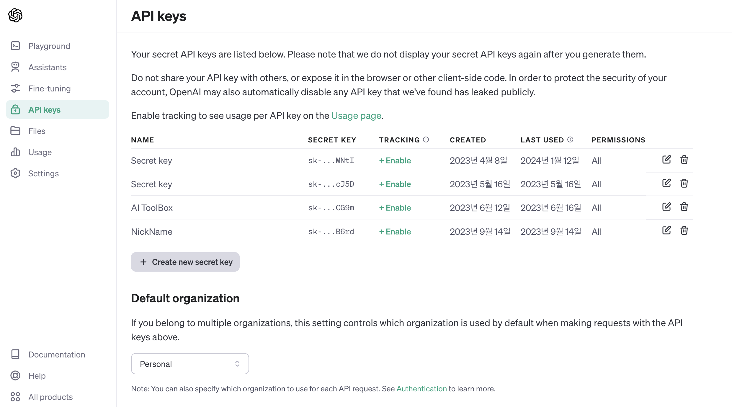 OpenAI 웹사이트(https://platform.openai.com/) 계정을 생성하고 API 키를 발급받아야 합니다. 발급받은 API 키는 다음 단계에서 사용됩니다.