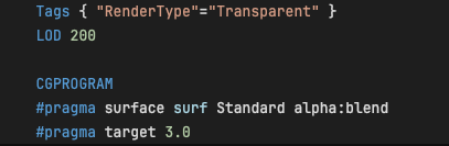 - 표면 셰이더 컴파일 지시자의 파라미터를 알파-블렌딩으로 변경합니다.