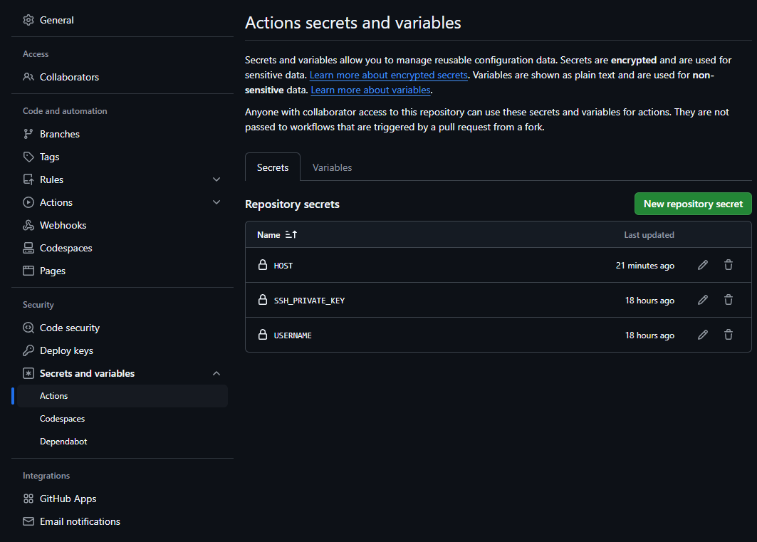 GitHub 레포지토리의 Settings > Secrets and variables > Actions에서 시크릿을 설정할 수 있습니다.