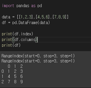 인덱스와 칼럼을 지정해주지 않았는데 알아서 데이터 길이에 맞게 열과 행이 생성되었습니다.