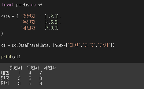 딕셔너리의 키 값이 열이 되었고 인덱스 값이 행이 되었습니다.