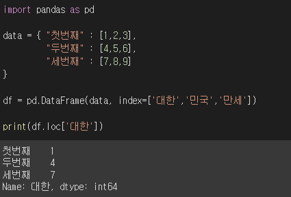 df.loc['대한'] 이 노란색이고 df.iloc[2] 가 주황색입니다