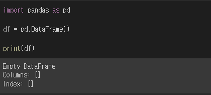 Columns 는 열이고 Index 는 행입니다. 현재 아무것도 지정해주지 않아 [] 으로 표현이 되었고 데이터도 없어 Empty DataFrame 라고 알려줬네요.