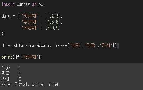 df['첫번째'][0] 는 첫번째 열의 0번 순서를 나타낸것입니다.
