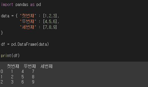딕셔너리의 키 값이 열이 되었고 인덱스 값이 행이 되었습니다.